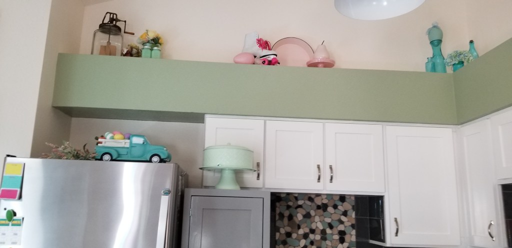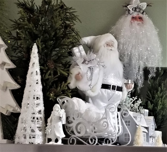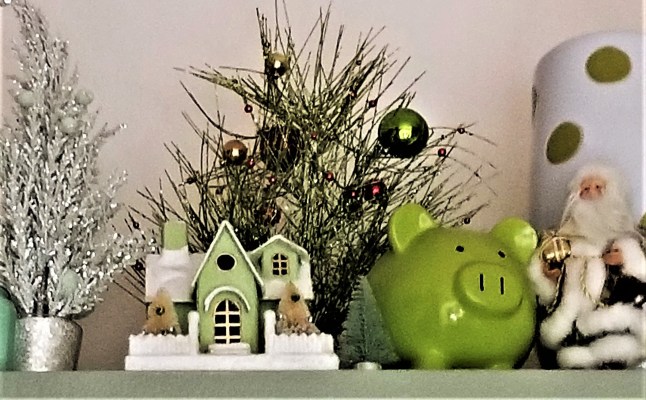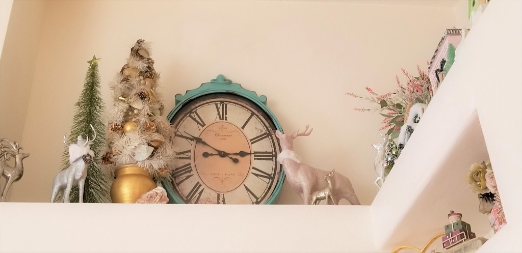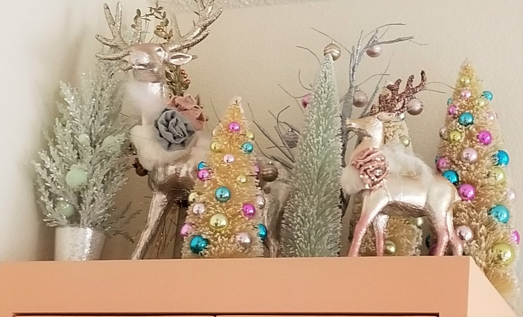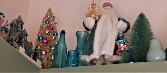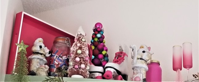 A forest of snowy (and more) trees unpacked and waiting to find their rightful places on the kitchen open shelving over the cabinets. But first, the greenery goes up.