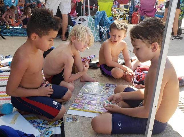 It seemed that practices and meets were not just about swimming; and not just about winning. There is a camaraderie among Pokemon collectors who gather at these pools; so much so that every practice is dotted with Pokemon cards laying on beach towels; on the concrete and on tables under the ramada. Everywhere you look – Pokemon.