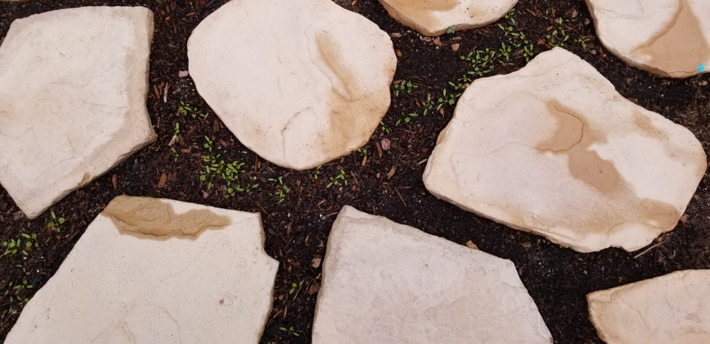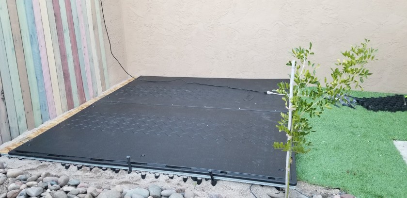 And after taking great pride on seeing how the entire 8×8 grid looked and just how well the level sat … I realized that the ground was too hard and even if it wasn’t, I had installed the entire grid (wait for it) UPSIDE DOWN! Back on go the gloves and each grid piece is “unlocked” from another and stacked up for another day. Back to my accounting work.