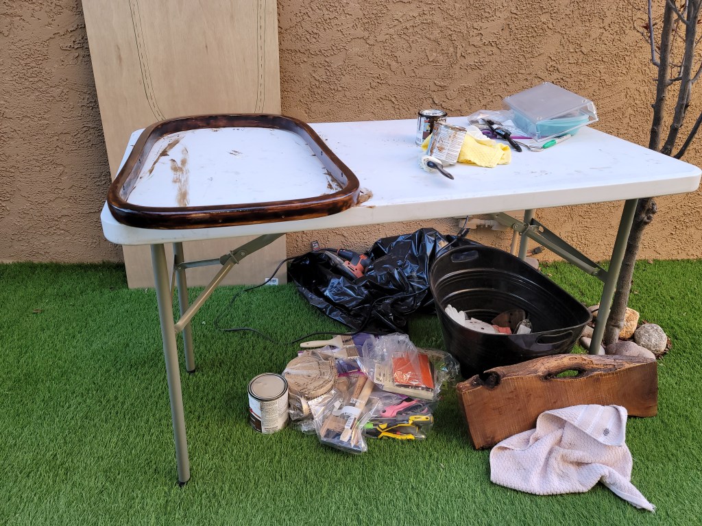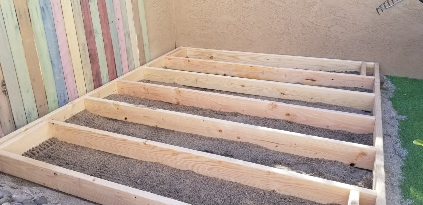 The next morning I am up and taking the entire thing down to the ground again. Third time should be (and was) the charm. The following weekend, my handyman, David to the rescue. He surmised the situation, trying his best to contain his somewhat judgemental head shaking; made a list and off to Lowe’s he went. Back a bit later and in a couple of hours built a perfect base of 2×6 lumber and treated plywood.