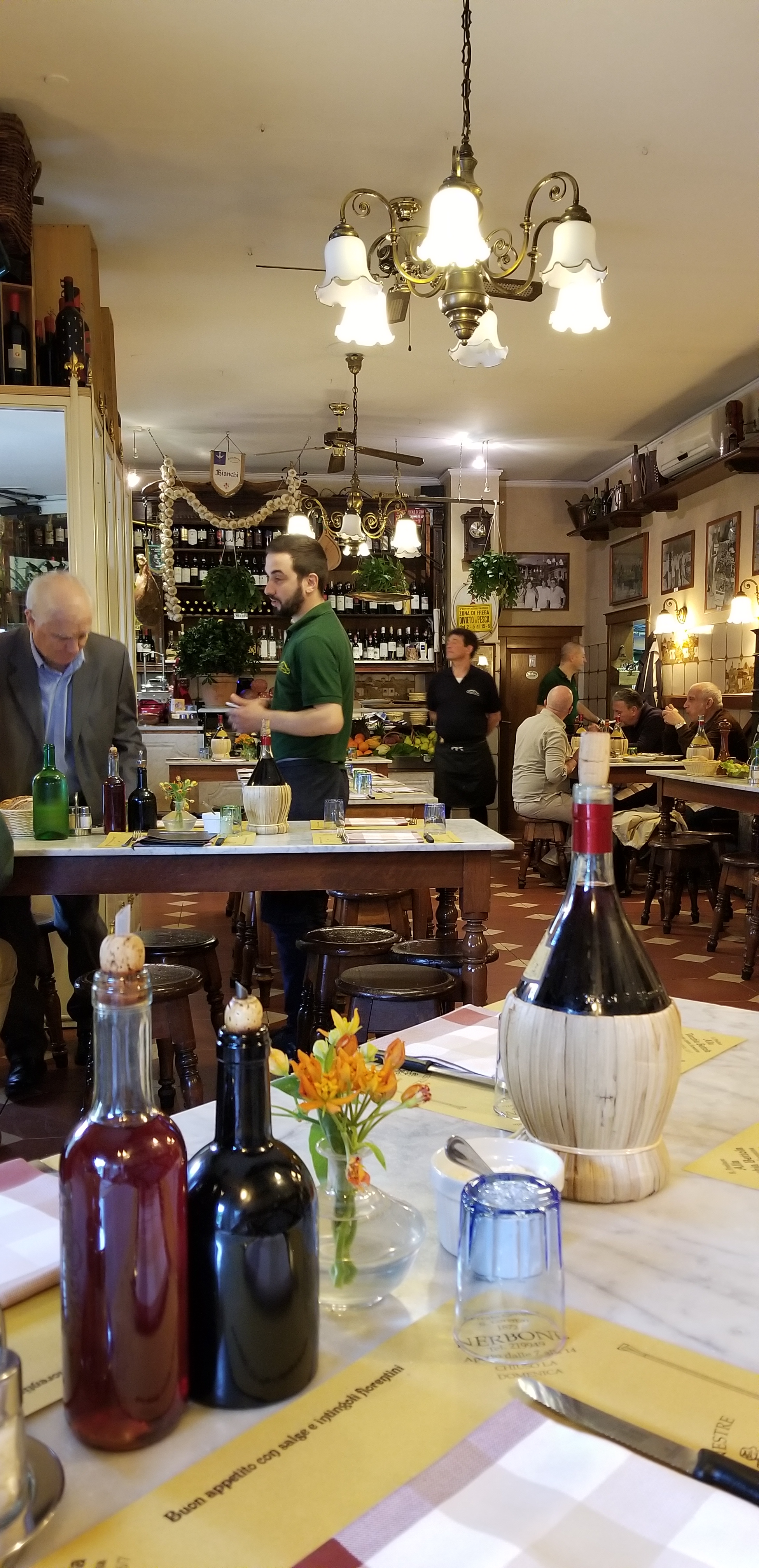 After dinner, a bit of accounting in my cozy cubicle 4B and snuggled up in my fluffy comforter and pillow to catch a bit of much needed sleep here and there mixed with my Amazon music in my headphones, the time passed relatively easy and comfortably for an 8+ hour flight. Just as we were landing in Paris, the sun was starting to rise. We retrieved our luggage (and way too much of it by the way) then made our way to the taxi area. We noticed several polizia with automatic weapons across their chests and ready at a moment’s notice. Our taxi driver explained that the Italian President Sergio Mattarella was visiting Florence for the 500th anniversary of the death of Davinci. Hence the additional security. Good to know!Checked into the beautiful AC Hotel Firenze (the Marriott), relaxed with a hot shower and a nap before heading out for dinner. We walked to a Ristorante Pizzeria – very authentic. Cute and homey decor. Ordered two different entrees (one was wood fired pizza – Yummy!) so we could share and taste. Since dinner hours begin at 7:30pm and then takes three hours, we were more than ready for a little Law and Order in Italian and a regular night’s rest!