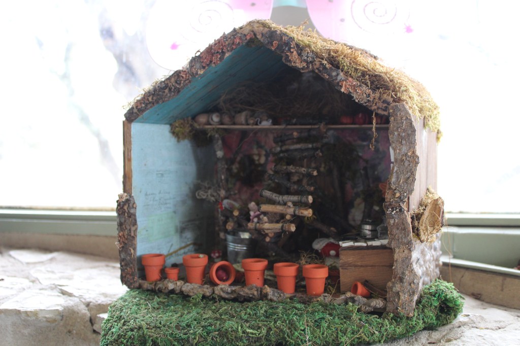 They have their art center with color pencils and water-color paint, lots of papers and books to work their designs. Legos and Barbies. A clock since their school teaches the kids how to tell time on such a non digital contraption! They have whiteboards and a rod with clips to hang important artwork and documents (one of which is titled “secret codes”). A couple of wires to hang artwork needing to dry. And 4 adorable battery LED lights that hang from the roof beams and turn on and off with the slightest of tugs.