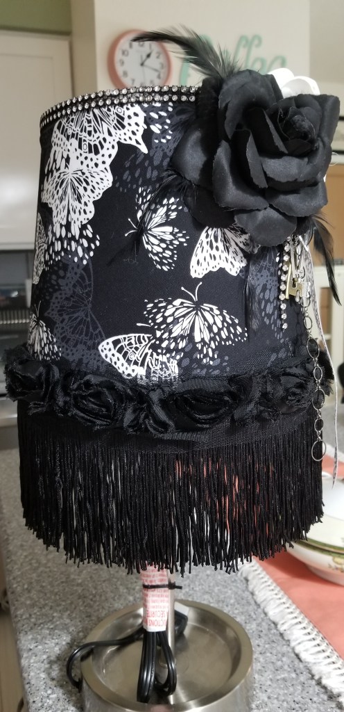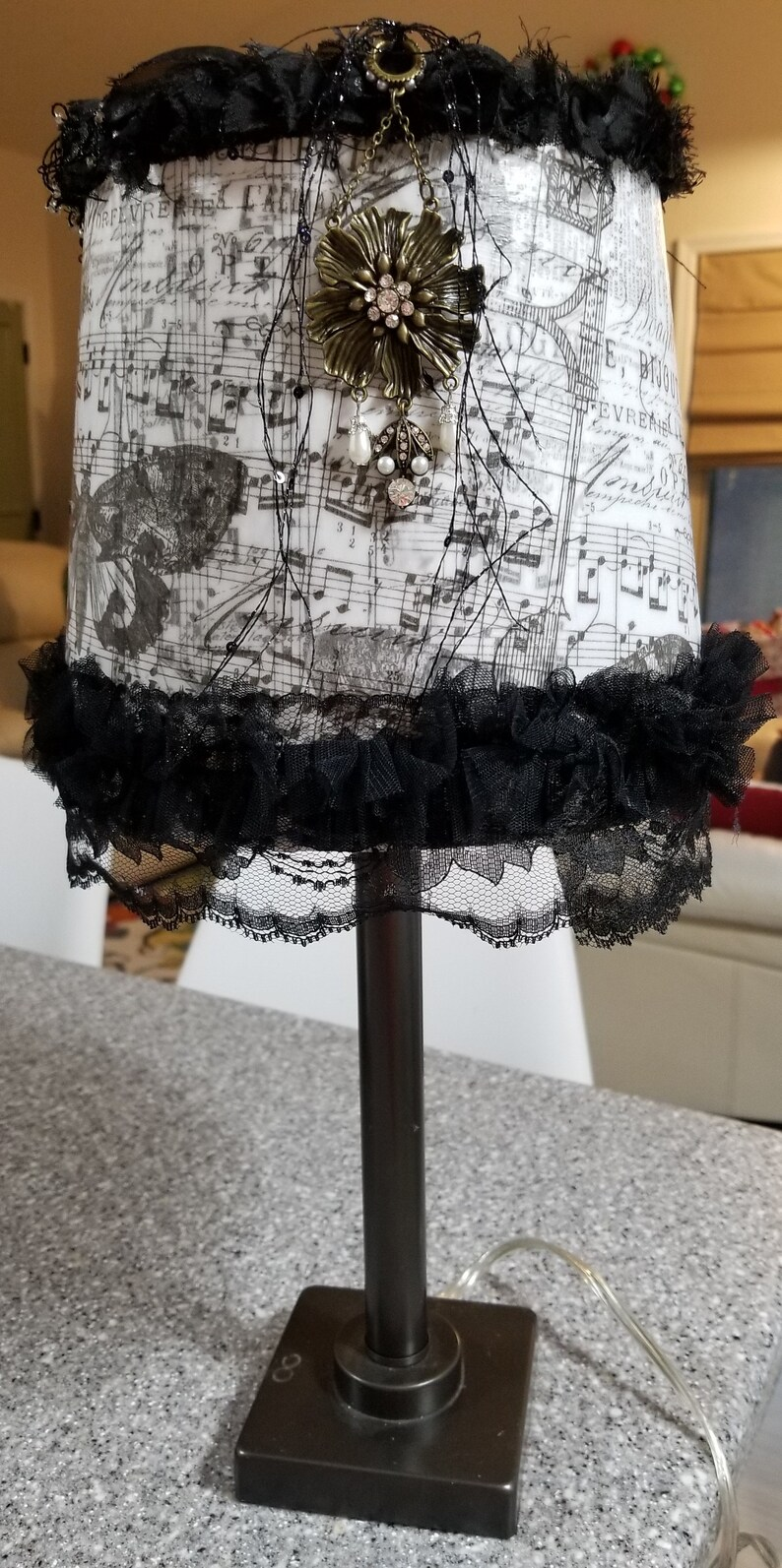 Vintage style ivory paper with butterflies and musical notes are decoupaged on a new shade and serve as the background for this sophisticated lamp accessory. Trimmed out with black fabric shabby/tattered roses; stringed trim with tiny black decor pieces; brass/black metal flower on a chain with rhinestones and hanging faux pearls; black lace on bottom.