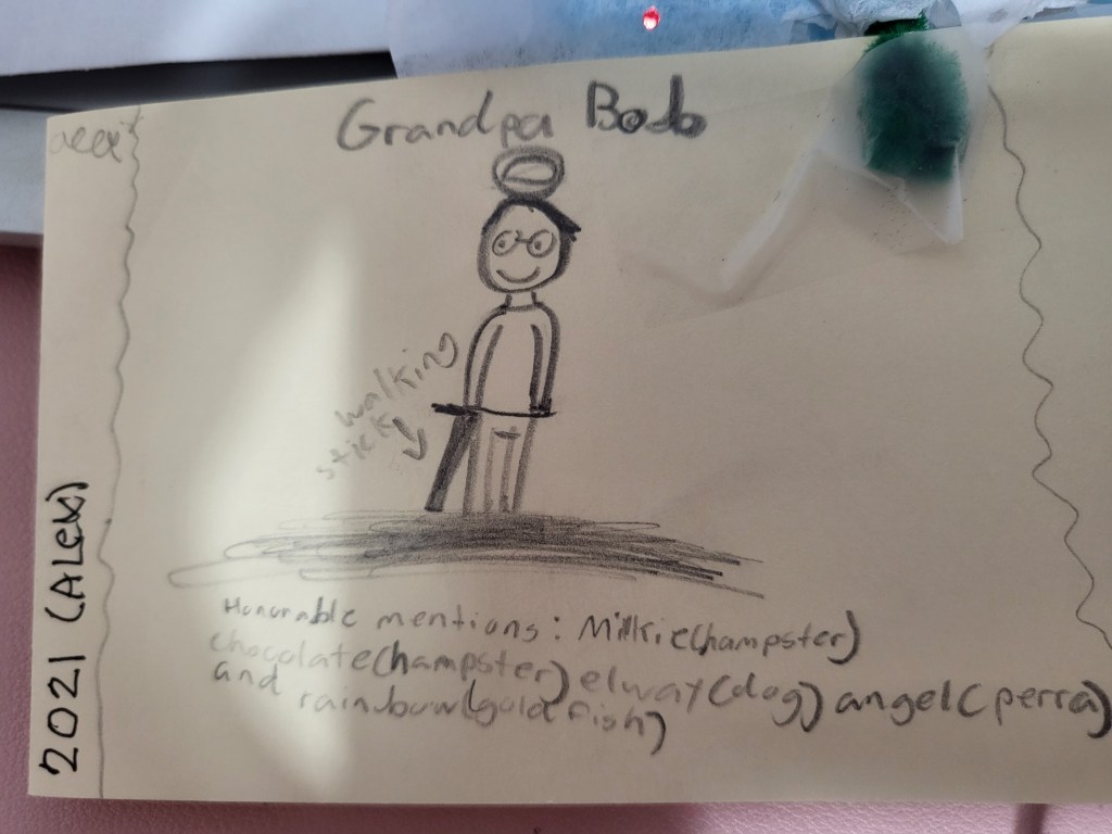 Alex made a little card one autumn day in 2021. On the front, he drew a man with glasses and a cane. A tissue paper flower was perched atop the card and below was written Grandpa Bob.