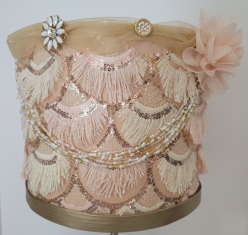 Sheer blush netting with alternating fans of tiny sequins and shabby chic strings in alternating colors of pale blush and ivory set the tone. Adorned with strands of tiny blush and white faux pearls, and pieces of upcycled jewelry set this shade apart from all of the rest. Top of shade is surrounded by light gold tulle, sheer fabric rose and rhinestones, faux pearls, enamel petal flowers, and gold filigree trim. Bottom of shade is covered with a medium gold leather trim.