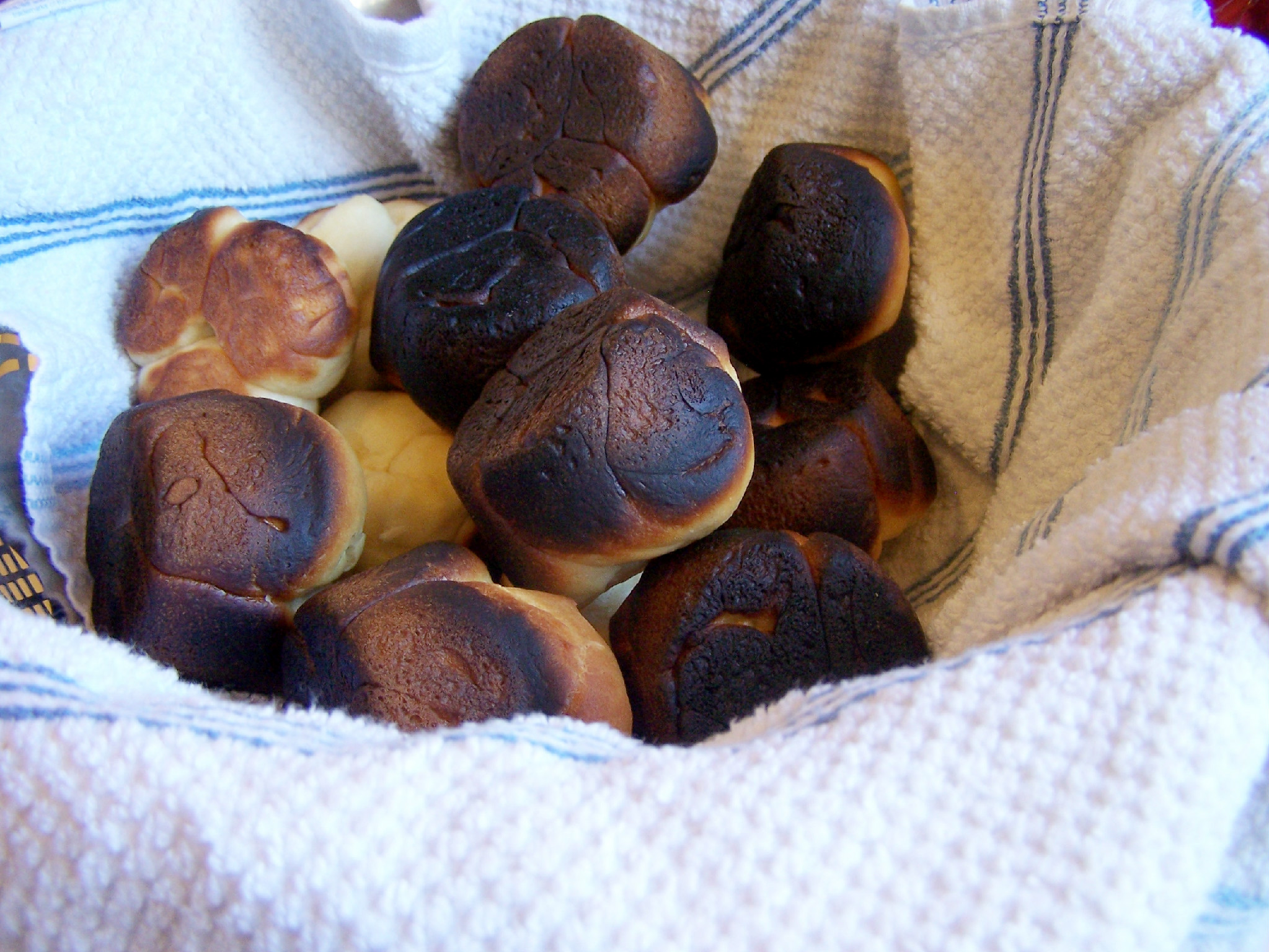 adj. the appearance of being burnt to a crisp, leaving the top of the roll still edible.