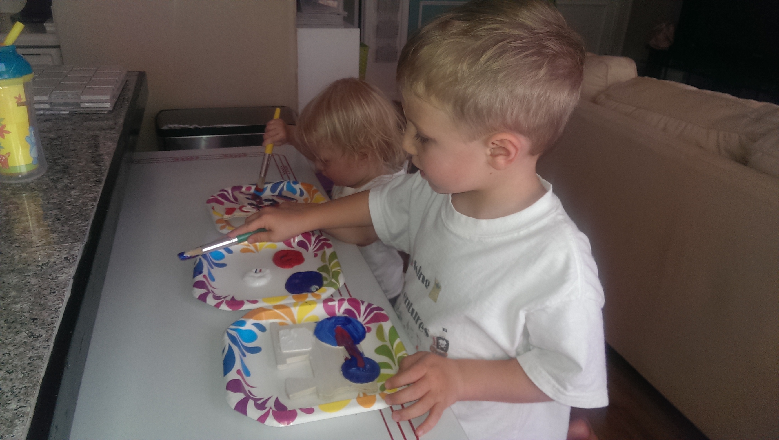 Since this was the day before the 4th of July, or as Max calls it “Ind-pendence Day”; the theme of the day was Red, White & Blue. Max painted a patriotic looking wooden train and added sparkly red, white & blue stars after the paint had dried. Abby worked on an equally patriotic wooden airplane. She is not much into spreading her stickers around a project – she likes to pile her sticky embellishments up in a stack, one by one all placed on top of the one prior.