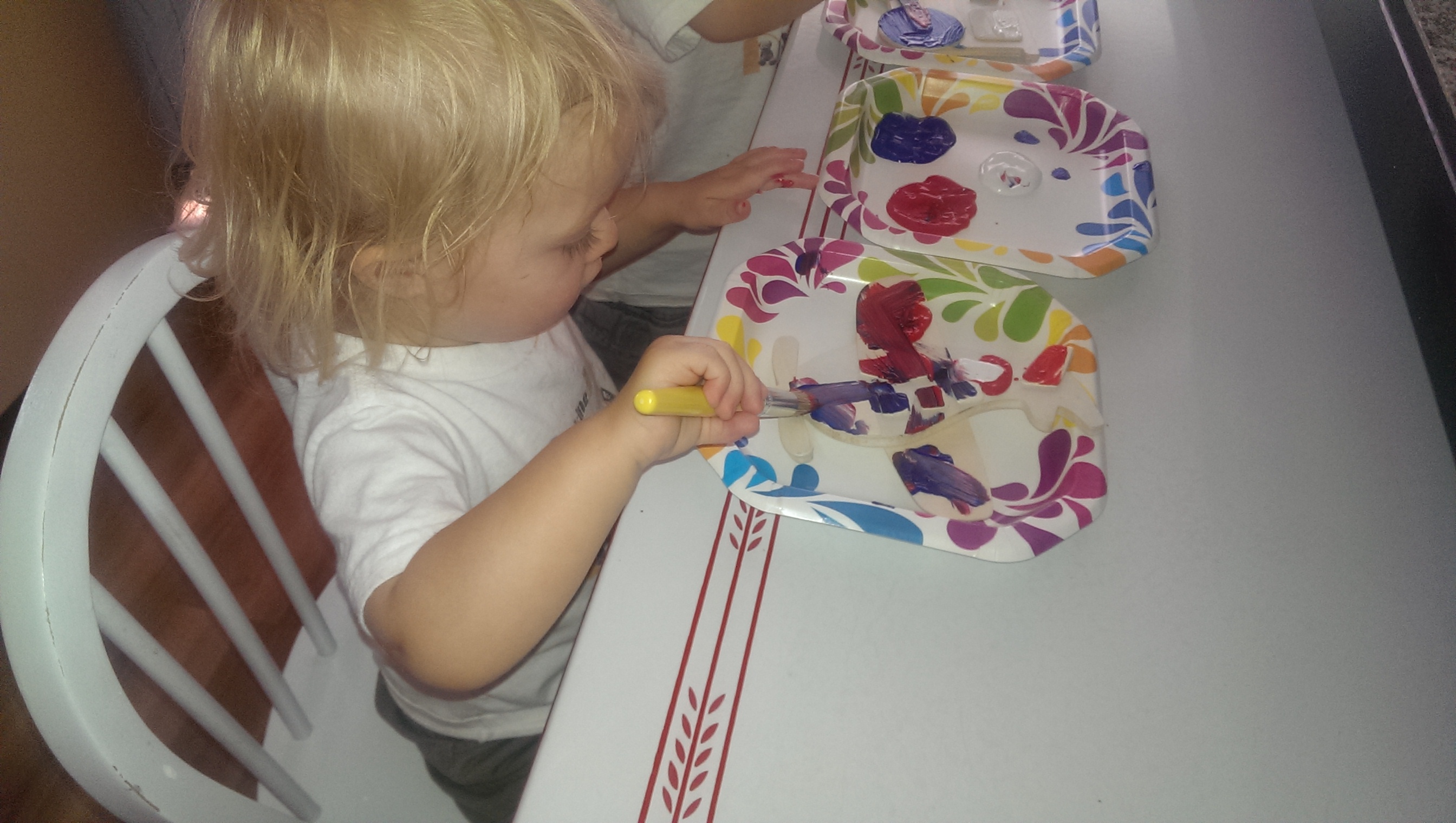After a little lunch and screen time, we were back to our red, white & blue projects. Next up, fireworks! White circles exploded with red, white and blue paint using a plastic fork and after a few embellishments, a handle was added to finish the project. Max had a great time making exploding noises as he held the “fireworks” high up and then fizzling out sounds on the way down.