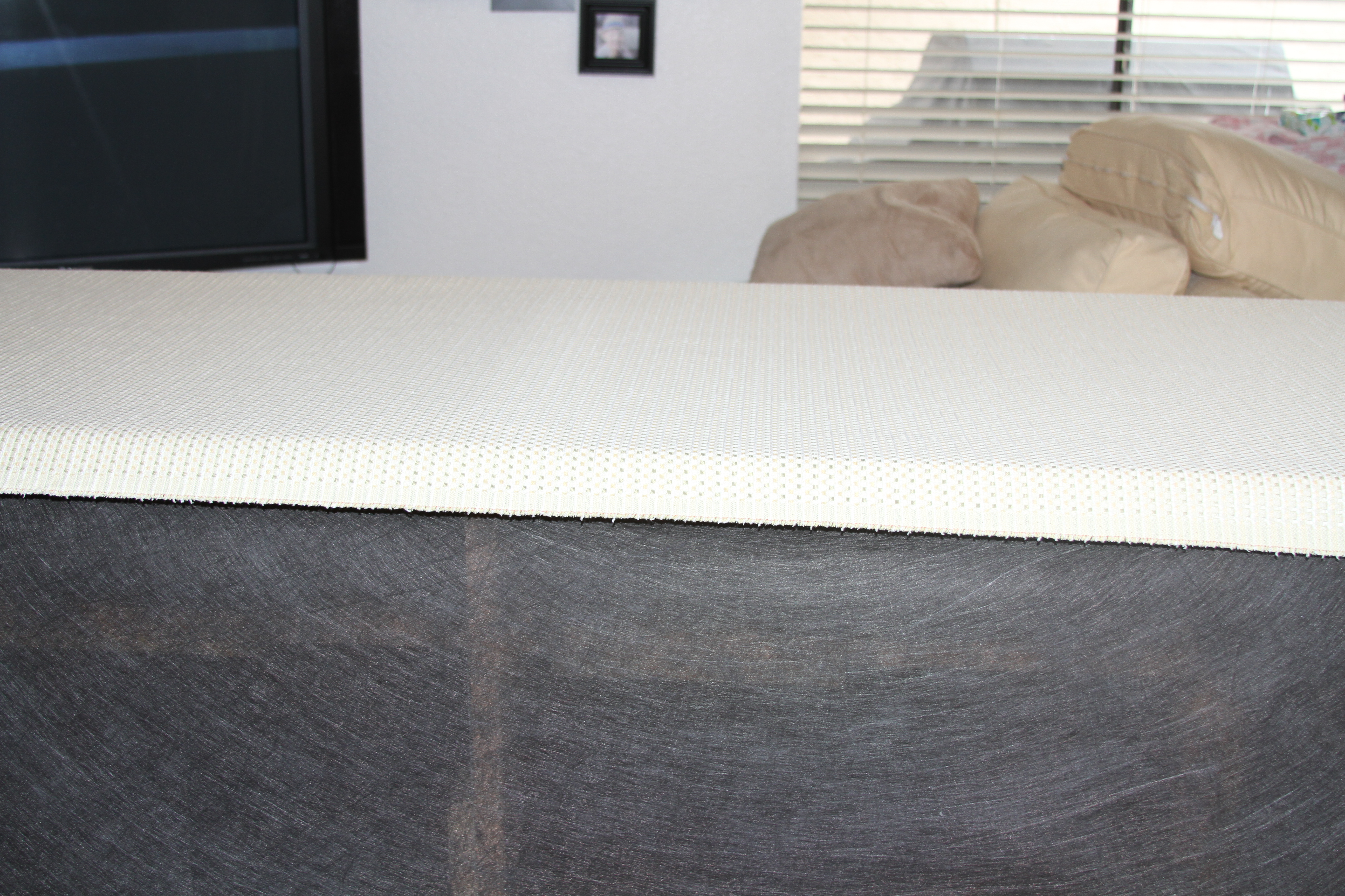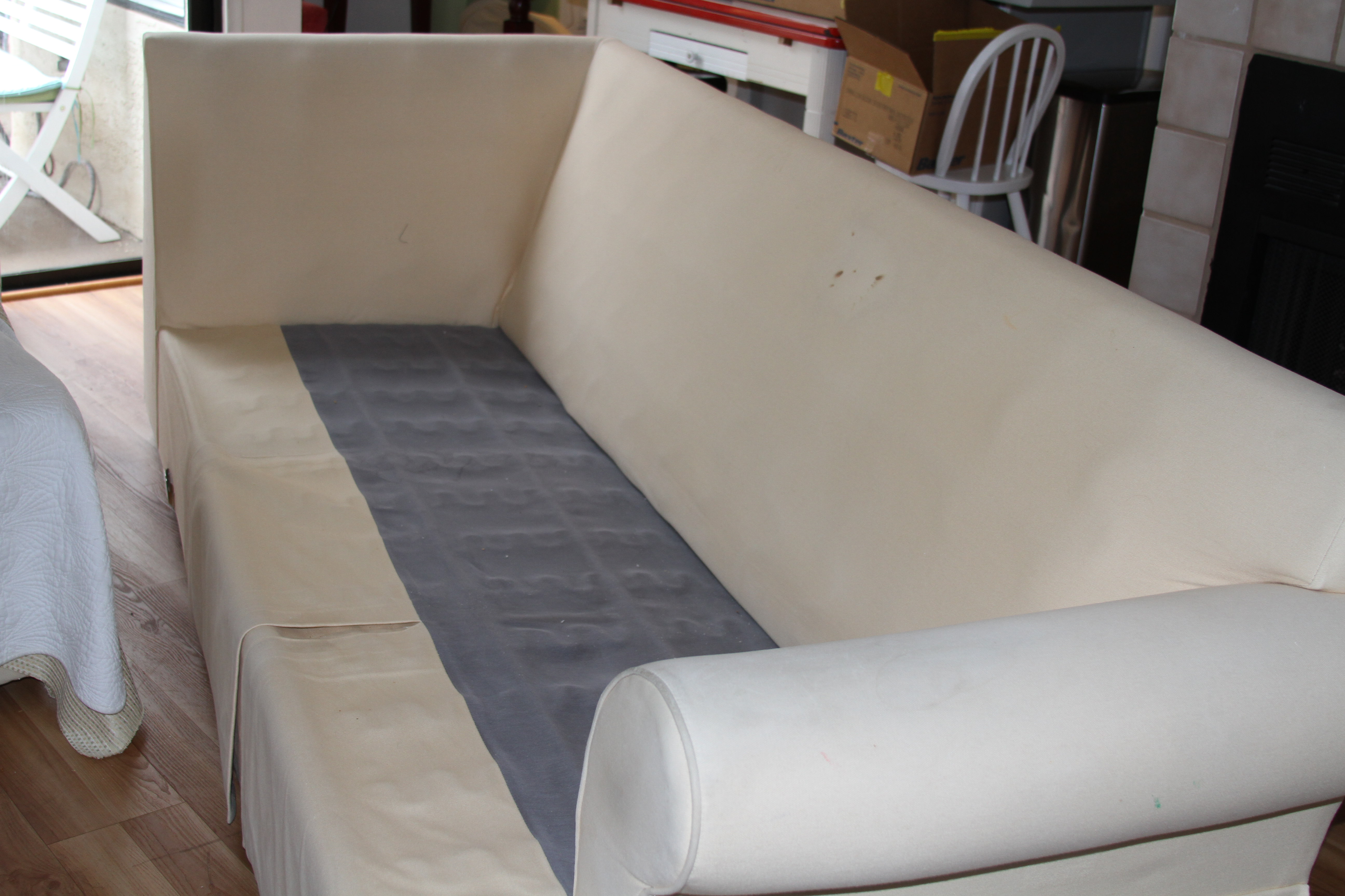 I removed all the back and seat cushions from both pieces of the sectional, tip them both over so that I am looking at the bottom of the sofa. I draped the fabric over the large piece, leaving about 3 feet of fabric hanging on each side and then do the same to the other piece. Since the backs are just flat, I think that would be the best place to start.
