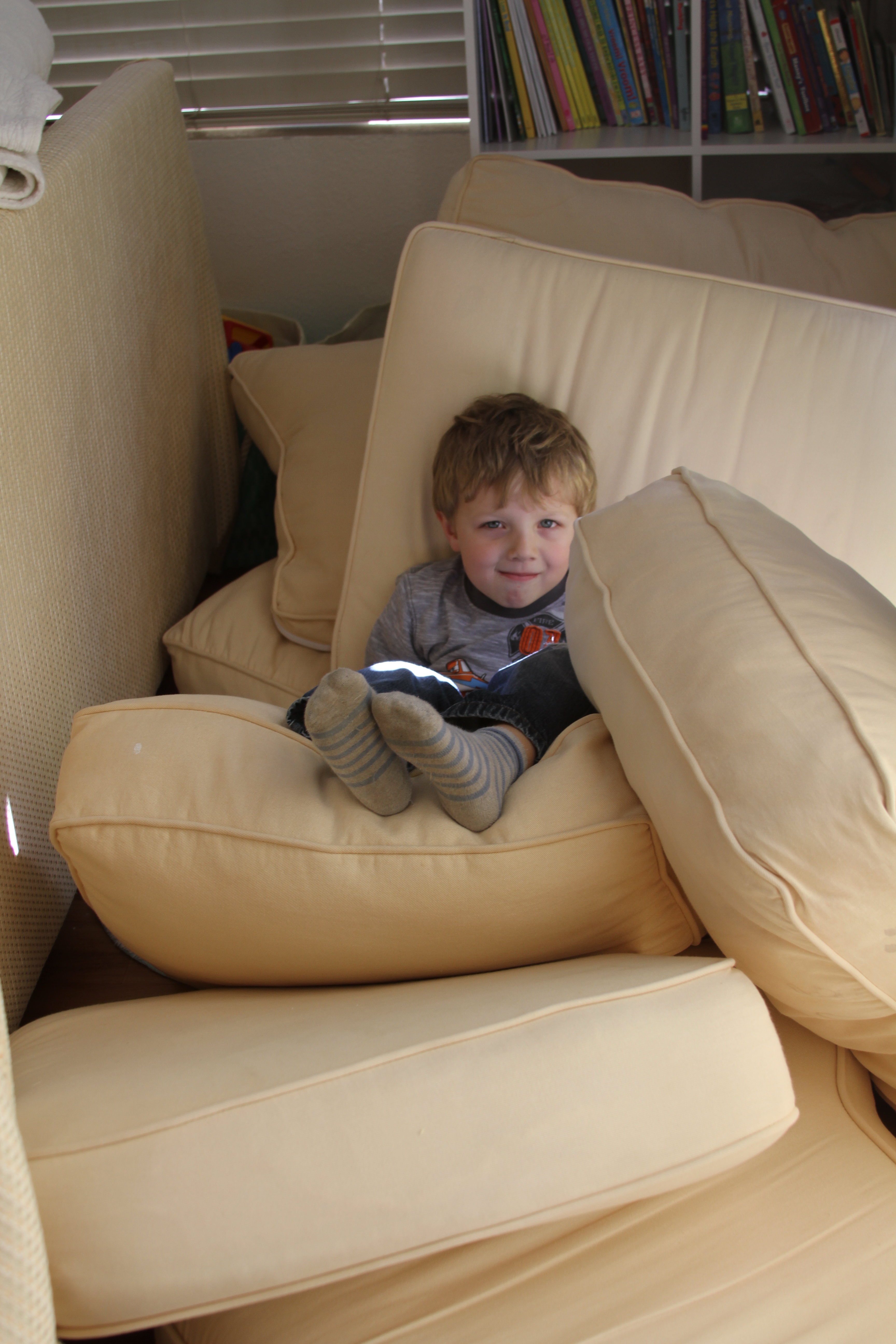 Say “Hello” to part of my ugly sofa. We bought this sectional in Virginia in May of 2010 before we moved into our brand new apartment. I love this sectional. It is yellow. It is roomy (seats 6). It is bouncy (just ask the grand kids). It is comfy. BUT … since it has been through grand kids in two states and of various ages; several Christmas open houses; family dinners and Easter get togethers, it is more than ready for a makeover. After drooling over $50 a yard fabrics at the fabric/craft stores, it was beyond my budget. Until one day when my friend, Joanne, advised me to pay a visit to Sas Fabric store. I had seen this store before, but figured it was more for able body seamstresses who knew what they were doing. So I took Joanne’s advice and headed down to Sas Fabrics. I found an amazing assortments of all types and colors and textures of fabrics at a fraction of the price at the other fabric/craft stores. Fabric that originally would sell for 38.99 per yard, was priced at 4.99. I took the fifteen yards they had left, figuring I would need at least 12 yards. $75 to cover the base parts of both pieces of the sectional was right up my alley. I will worry about getting complimentary fabric for the twelve cushions later.