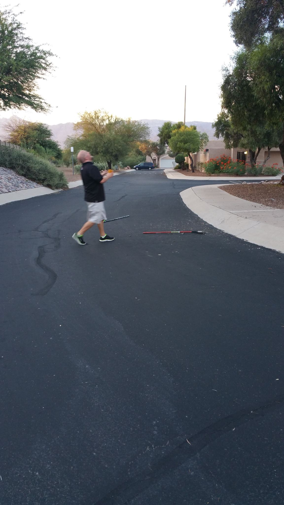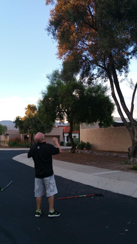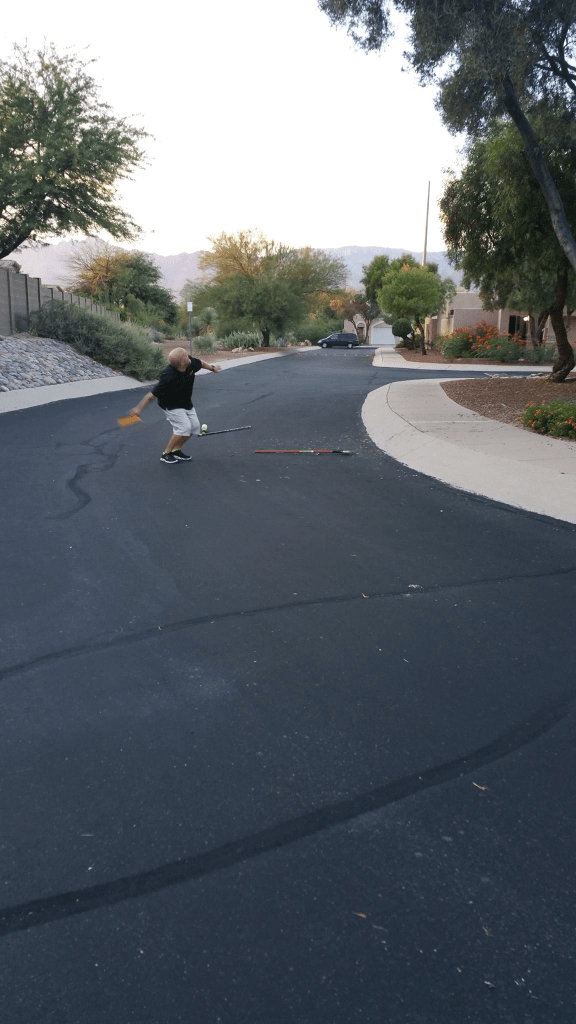 Hit the foam softball with the little green plastic bat. Hit it so hard that it landed in a tall olive tree – and there it stayed. He surmises that to release the ball from the tree, a good toss of the plastic green bat should do the trick. Now, the next logical step is to find something to nudge the foam ball and the green plastic bat – a small leaf rake should do the trick. Who would have thought that the olive branches would grab hold of the small rake in that way. Scouting out our garage, boy genius grabs a large push broom and heads down the street to the foam ball plastic green bat small leaf rake eating olive tree with determination. A few javelin like tosses of the push broom sends the green plastic bat to the ground. A few more release the small leaf rake. It seems as though nothing will release the foam softball, but boy genius will not be deterred. Armed with the deadly large push broom, another toss and crack crack. The push broom returns to earth where the brush part of the broom breaks in half. Now, hard tosses of each of the broken pieces of the broom, and … nothing. After several more attempts, a defeated boy genius returns to our garage with only a green plastic bat, handle of a push broom and a small leaf rake. Lost in the grabby tree is a foam softball and two halves of a push broom brush. All wait for another day. Time for boy genius to rest.