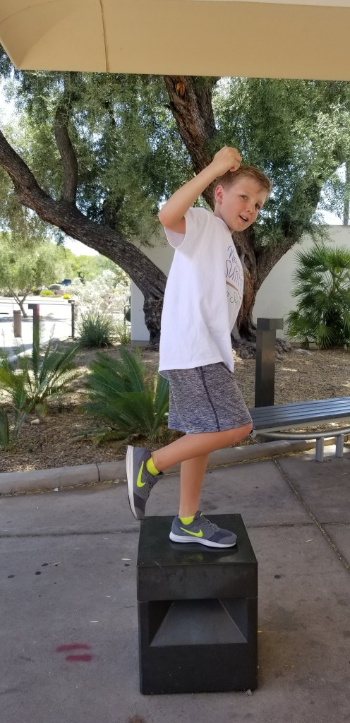 The Pima County Public Libraries are all giving away one free book to any teen or child stopping by this week, to encourage summer reading. Max and Abby need no encouragement as they have their noses in a book often; but hey, who doesn’t love a free book? They perused the books and made their choices and began reading their new material while walking out of the library door. I had to remind them that reading while walking could be dangerous! They took a minute to strike a library pose before departing the area.
