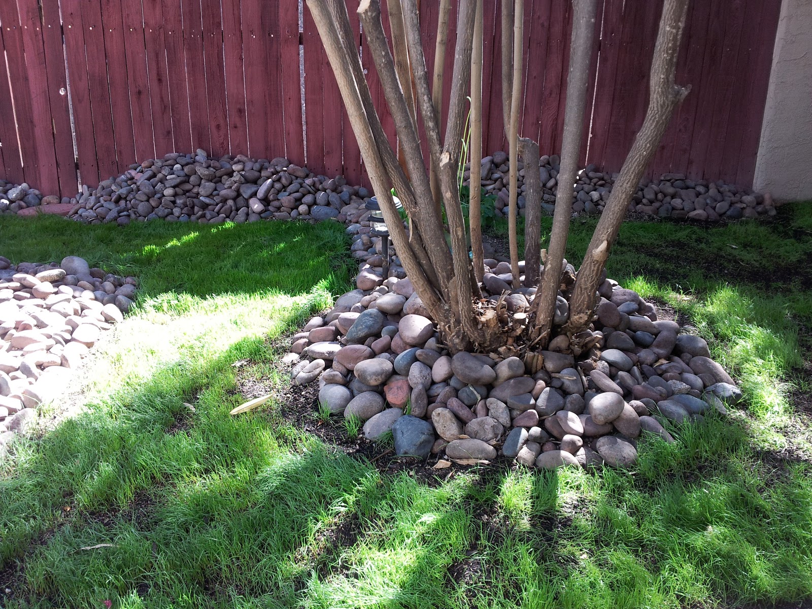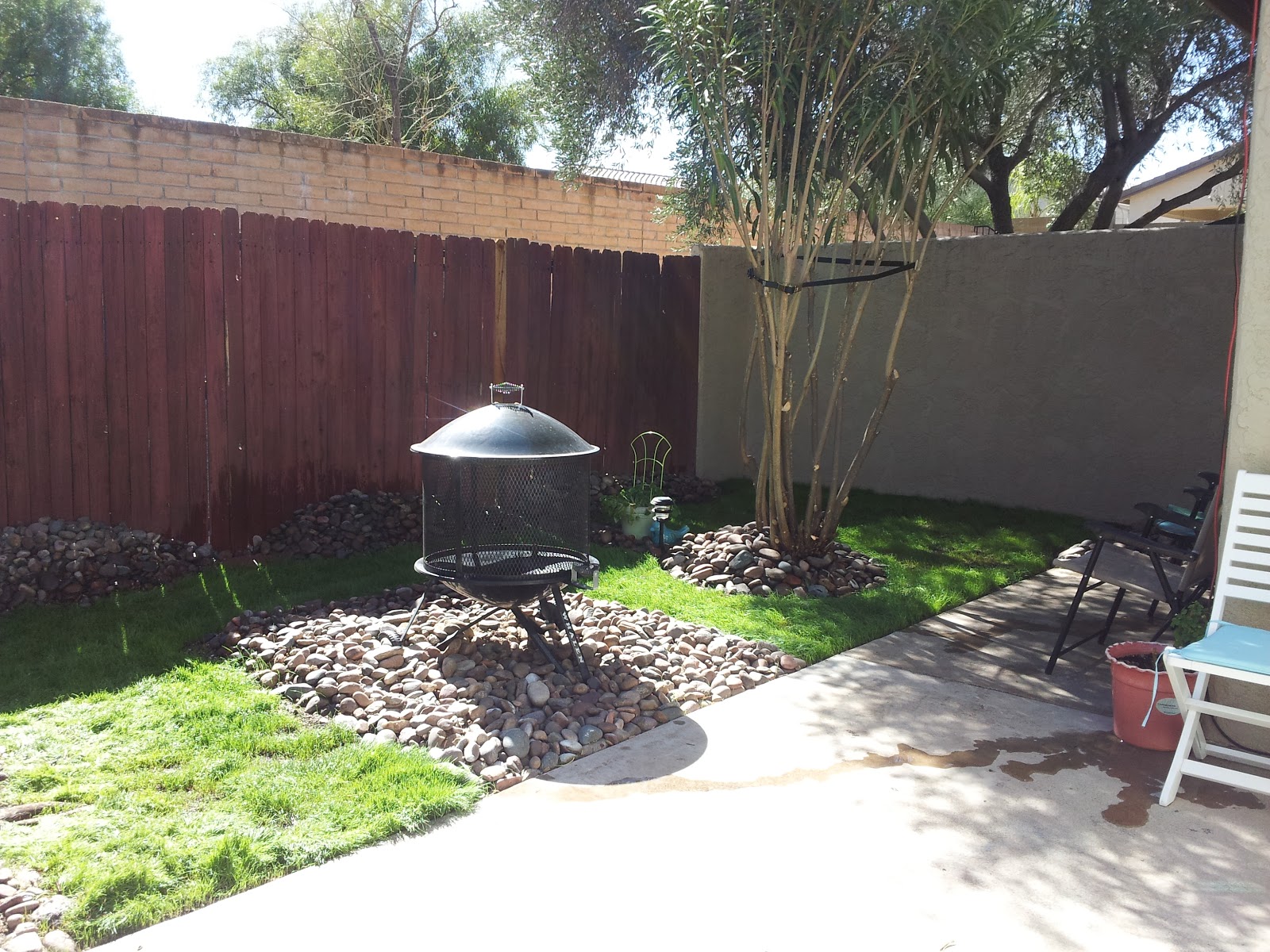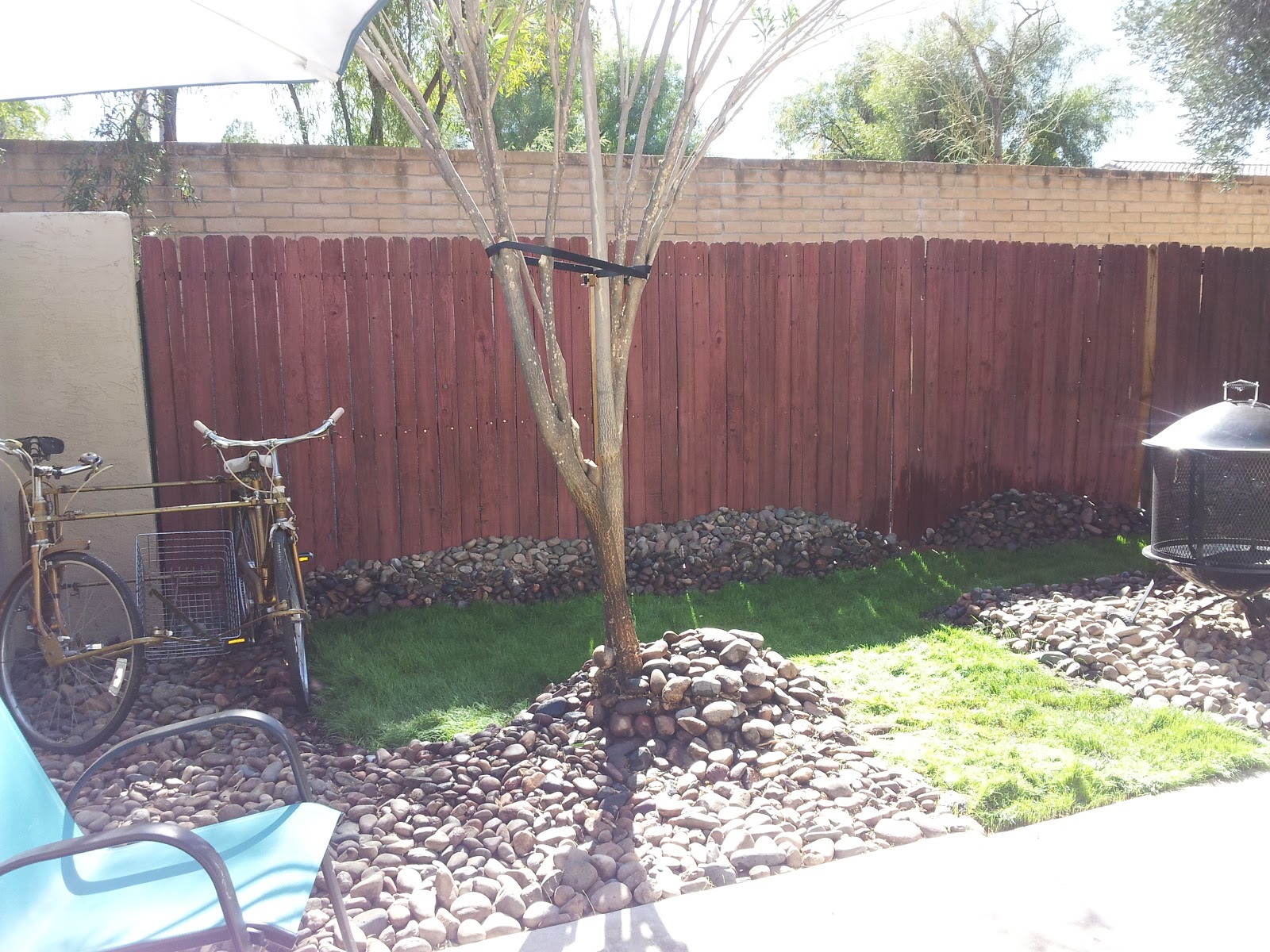 After cutting down and hauling away over 600 pounds of Oleander dead branches – moving a ton of rocks around- adding special seeding soil and spreading winter lawn seed (annual ryegrass) – voila! Here is the new tiny backyard!