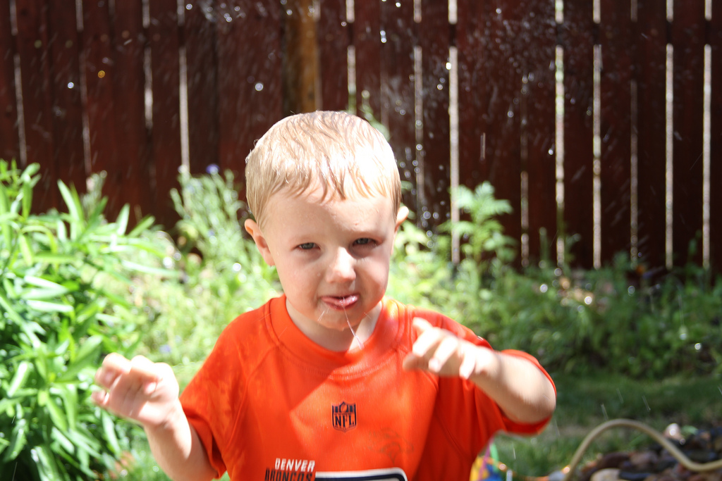 The kids started getting restless in the little house and so I hooked up a wacky water thingy and let them cool off a bit in the backyard, much to their delight!