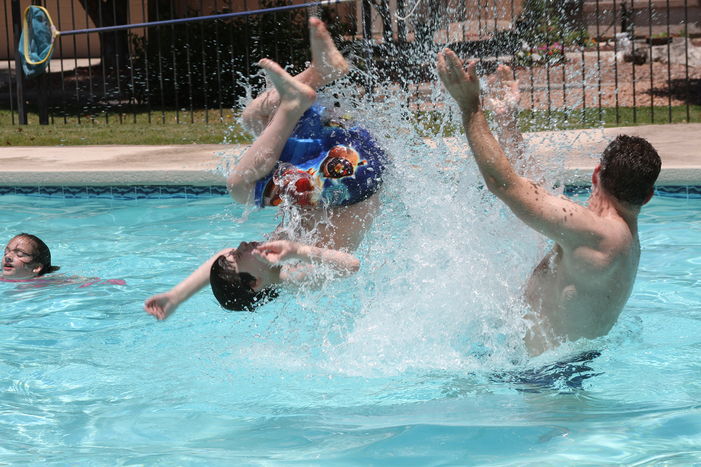 After a good night’s sleep and playing with cousins, the grand kids were all ready for water time! Ricky, Jeffry and Kerri loaded up the cars with kids and sunscreen and towels and water and snacks and headed to the Mundle neighborhood pool. My three little M&M&Ms are true water babies and cannot seem to get enough splashing and jumping!! They are fearless!